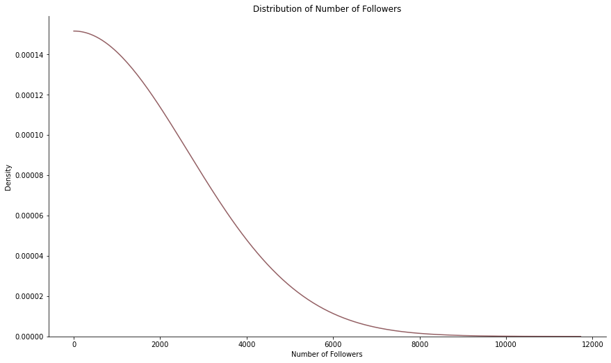 g.fig.set_figwidth(15) g.fig.set_figheight(7.5) g.set(xlabel='Number of Followers', ylabel='Density', title='Distribution of Number of Followers')