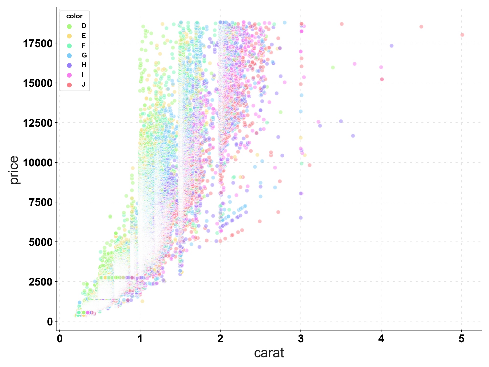 A quick look at the data: We got information on diamonds, their characteristics and their prices. A classic example is to plot the diamond’s price against their weight in a scatterplot and color the points by the diamond’s color.